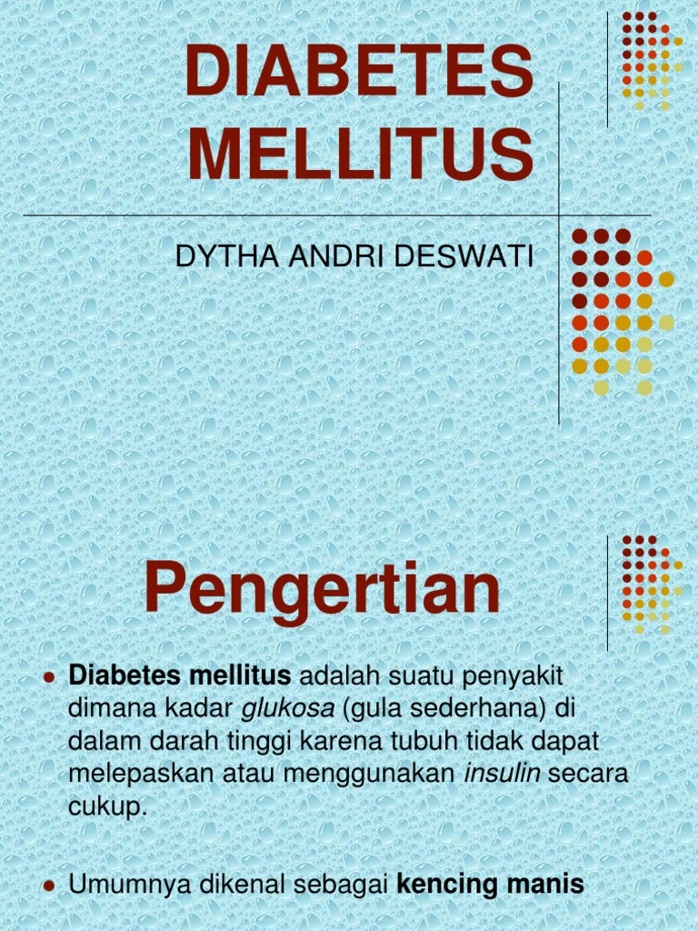 Diabetes mellitus refers to a group of diseases that affect how your body uses blood sugar (glucose). glucose is vital to your health because it's an important source of energy for the cells that make up your muscles and tissues. it's also your brain's main source of fuel. the underlying cause of diabetes varies by type. Type 1 diabetes is always treated with insulin injections. in most cases, type 2 diabetes treatment begins with weight reduction through diet and exercise. a healthy diet for a person with diabetes is low in total calories, free of trans fats and nutritionally balanced, with abundant amounts of whole grains, fruits and vegetables, and monounsaturated fats. most people with type 2 diabetes need drug therapy to control blood sugar. however, it is possible to achieve normal blood sugar levels with Diabetes initially might not cause any symptoms. it can sometimes be caught early with a routine blood test before a person develops symptoms. when diabetes does cause symptoms, they may include: 1. excessive urination 2. excessive thirst, leading to drinking a lot of fluid 3. weight loss. people with diabetes also have an increased susceptibility to infections, especially yeast (candida) infections. when the amount of insulin in the blood stream is too low, extremely high blood sugar levels c Diabetes mellitus is a condition defined by persistently high levels 4. diabetes mellitus of sugar (glucose) in the blood. there are several types of diabetes. the two most common are called type 1 diabetes and type 2 diabetes. during digestion, food is broken down into its basic components.